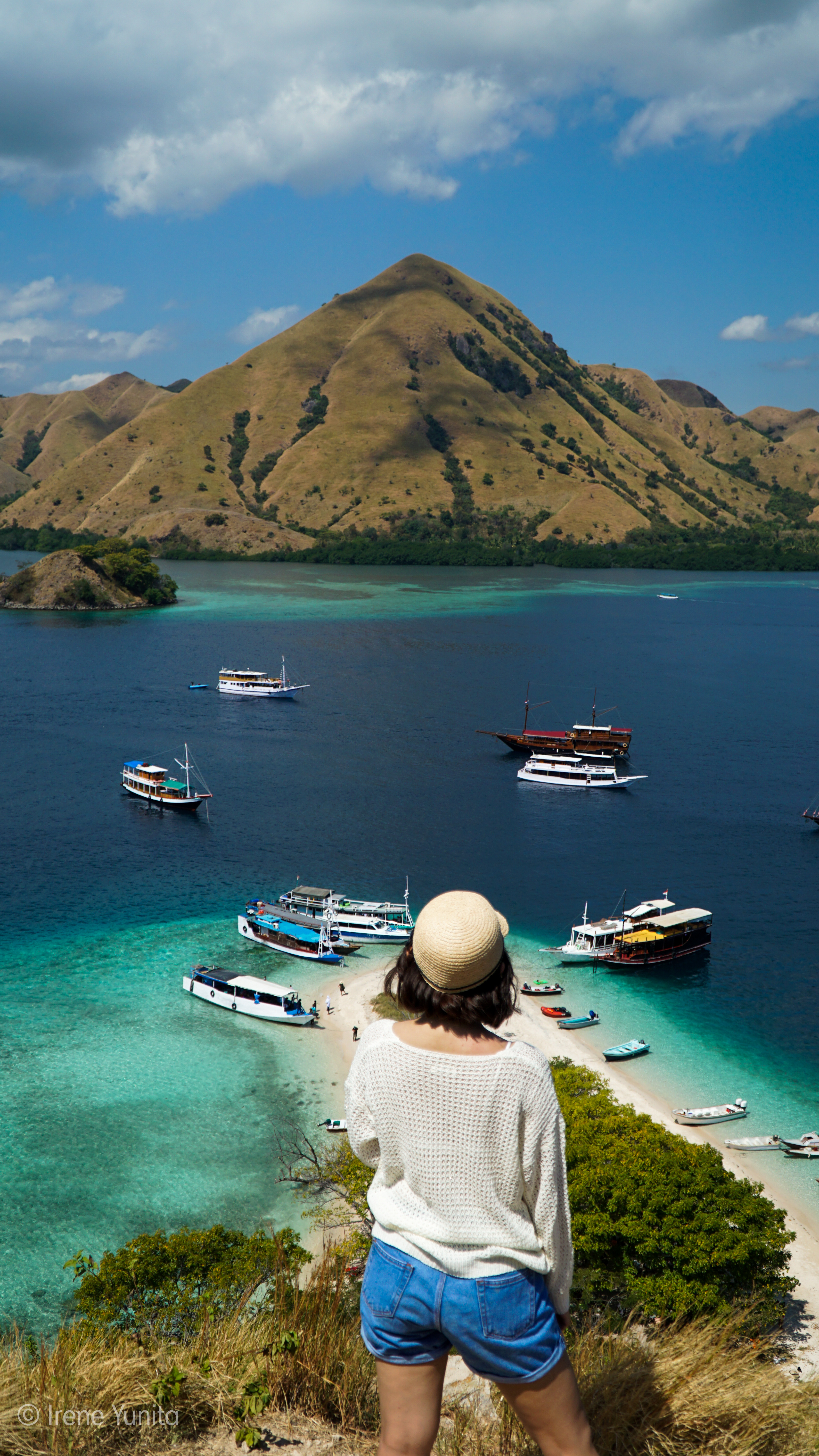 Spot pertama yang kami kunjungi adalah pulau kelor, karena tidak terlalu jauh dengan dermaga Labajo, untuk bisa sampai keatas pastikan kamu tidak memakai rok ya untuk treknya hanya mengandalkan tingkatan pasir dan beberapa kerikil bebatuan, tanpa adanya bantuan tangga, saat itu udara sangat terik sekali. Sebelumnya saya sudah menaklukan Ijen, jadi untuk trek seperti ini saya bisa tangani dengan mudah, hanya butuh waktu beberapa menit saja untuk sampai ke atas. Kelor, pemandangan indah sekali warna air laut, bukit-bukit disekitar, dan juga kapal-kapal bersandar.